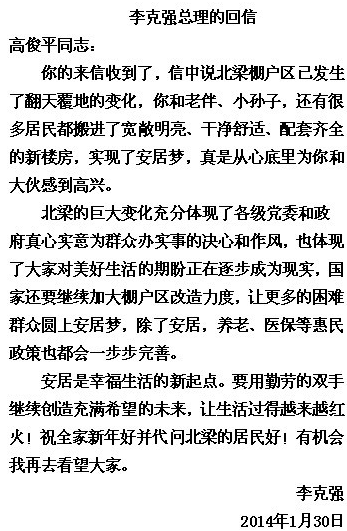 光屁股小孩收李克强总理回信 阳光高考门户(26-04-08) yggk.net导读:包头光屁股小孩一家日家人除夕日收到了李克强总理回信。日理万机的总理为什么会给光屁股小孩回信呢?事情缘于2013年2月3日,李克强视察包头北梁棚户区改造情况,到高俊平家走访,高俊平的小孙子光屁股“闯进”《新闻联播》节目镜头,被网友亲切唤作“光腚娃”。光屁股小孩就这样出名了!今年1月15日,高俊平给总理写信,介绍了北梁一年的变化。