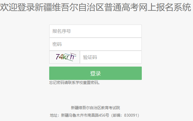 新疆高考报名系统入口:www.xjzk.gov.cn 阳光高考门户(25-11-19) 欢迎登录新疆维吾尔自治区普通高考网上报名系统报名序号https://ptgk.xjzk.gov.cn:8443/XJGK/stufrontend/报名序号密码密码验证码点击刷新验证码验证码http://m.yggk.net/article/21218.html忘记密码请联系学校重置密码。新疆维吾尔自治区教育考试院地址:新疆乌鲁木齐市南昌路456号(邮编:830091)