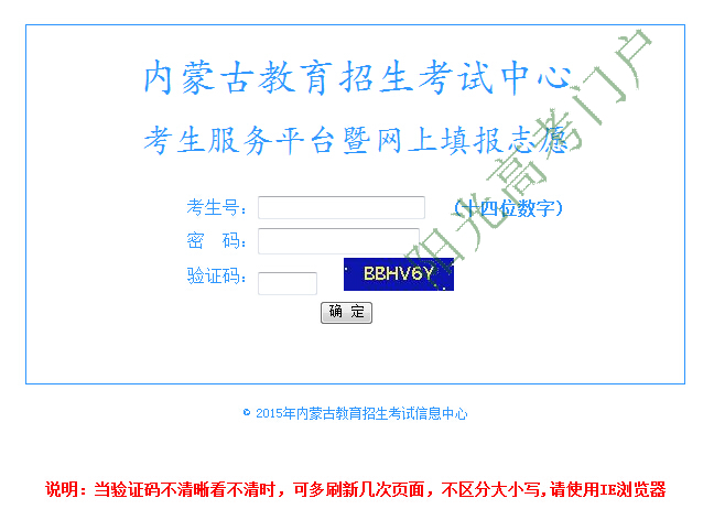 内蒙古高考志愿填报http://www1.nm.zsks.cn/kscx/login.jsp yggk(70-01-01) 阳光高考门户整理:内蒙古教育招生考试中心考生服务平台暨网上填报志愿入口网址:http://www1.nm.zsks.cn/kscx/login.jsp入口截图:提示说明:当验证码不清晰看不清时,可多刷新几次页面,不区分大小写,请使用IE浏览器