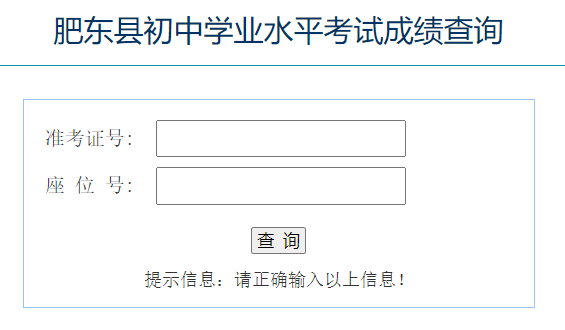 肥东县初中学业水平考试成绩查询:https://fdcj.hfzsks.org/ 阳光学习网(25-11-19) 阳光学习网免费分享合肥市肥东县初中学业水平考试成绩查询:https://fdcj.hfzsks.org/中考信息查询您现的位置:首页 > 中考信息查询 肥东县初中学业水平考试成绩查询准考证号: 座 位 号: http://m.yggk.net/article/55711.html提示信息:请正确输入以上信息!
